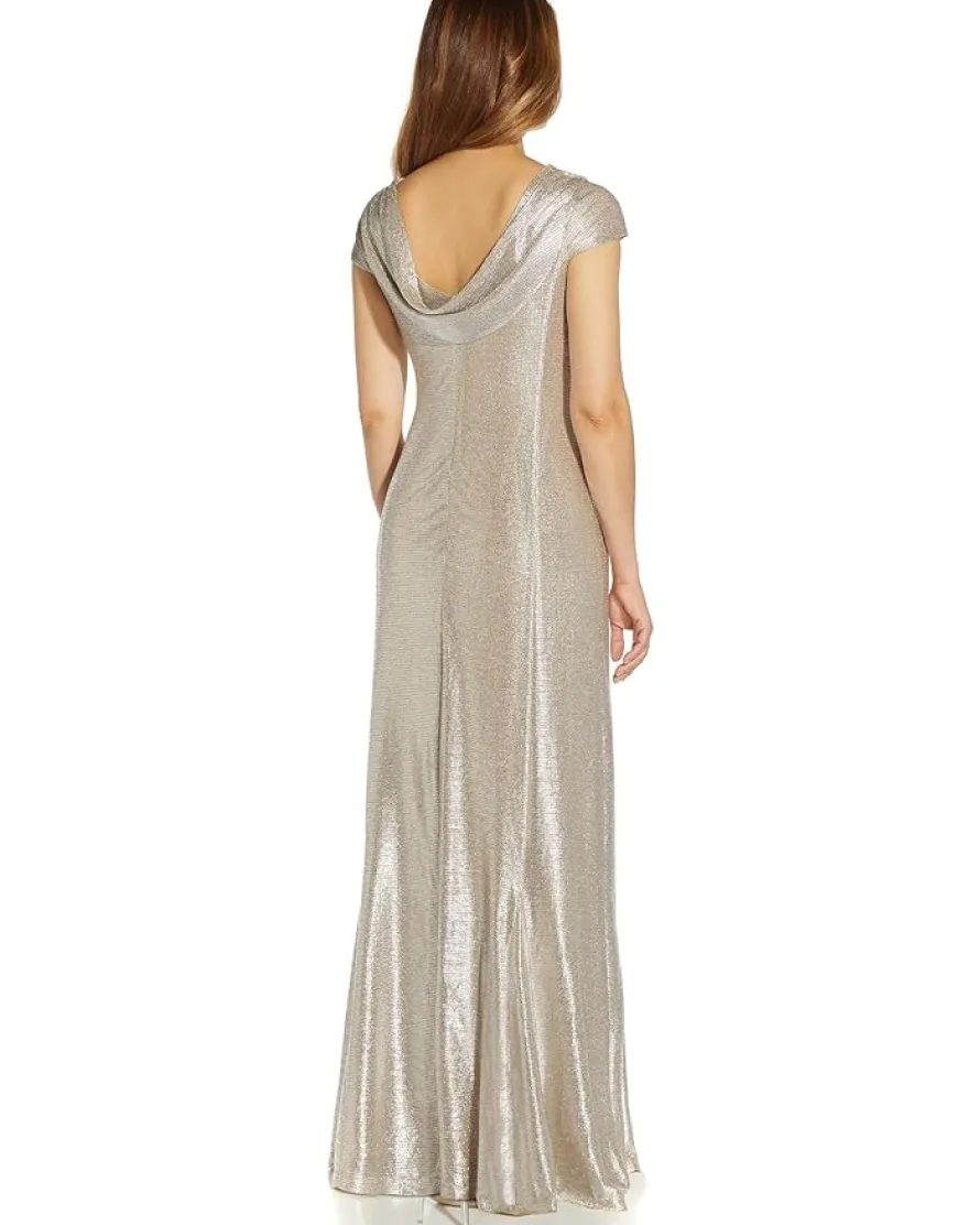 - Look graceful in this alluring yet sophisticated, a showstopping Adrianna Papell® Metallic Knit Drape Neck Gown, designed in a soft and shimmering metallic foil. It is every bit stunning from the drapped neckline to the floor-grazing hem. It features ruched detailing along the waist for added texture and dimension.
