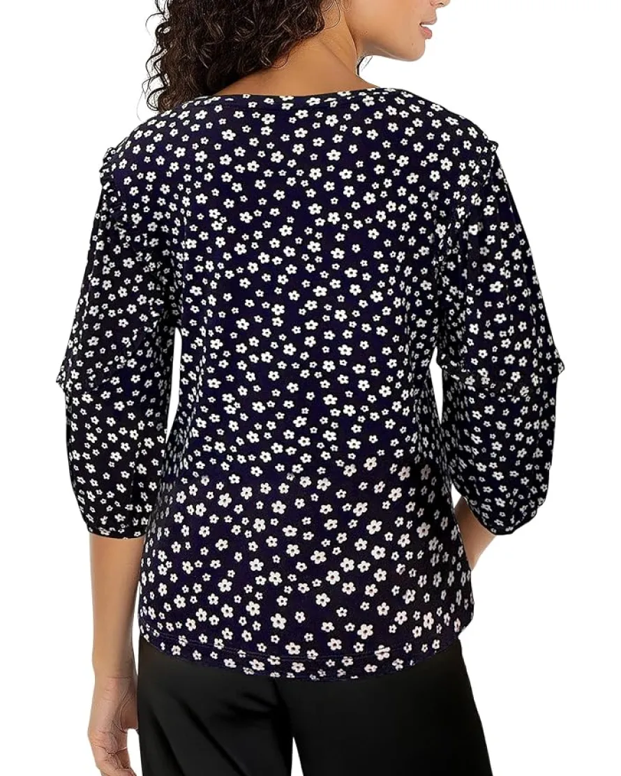 - Enhance your outfits with the Liverpool™ Los Angeles Mid-length Ruffle Sleeve Scoop Neck Knit Top, featuring a charming ditsy floral print that adds a refined touch to any look. This printed top is made from a jersey knit for a comfortable feel. It is styled with elbow-length sleeves, elasticized barrel cuffs, a scoop neckline, and a straight hem. This versatile piece is suitable for any occasion, allowing you to dress it up or down as needed.