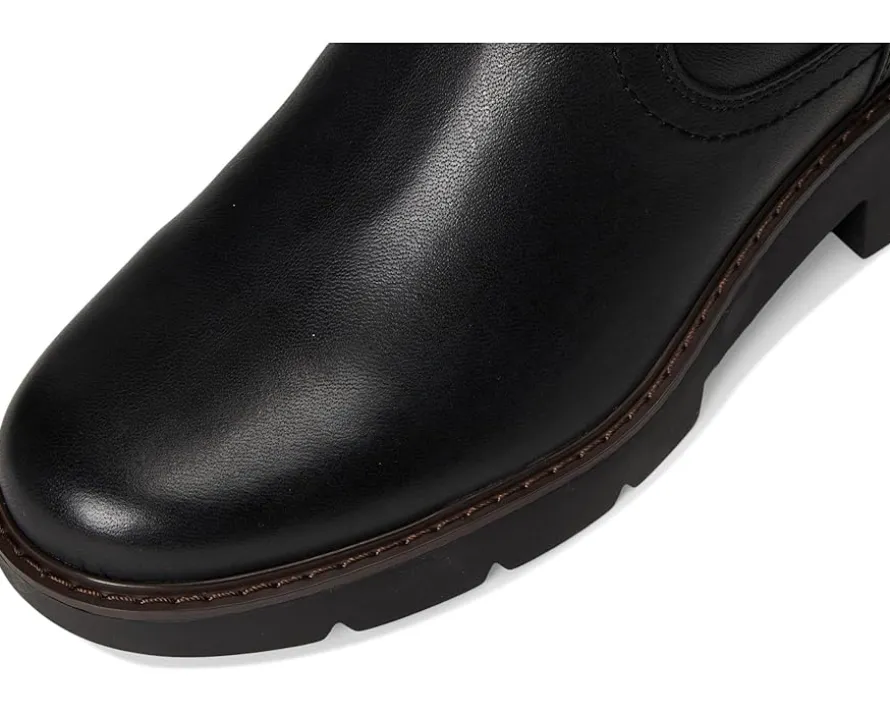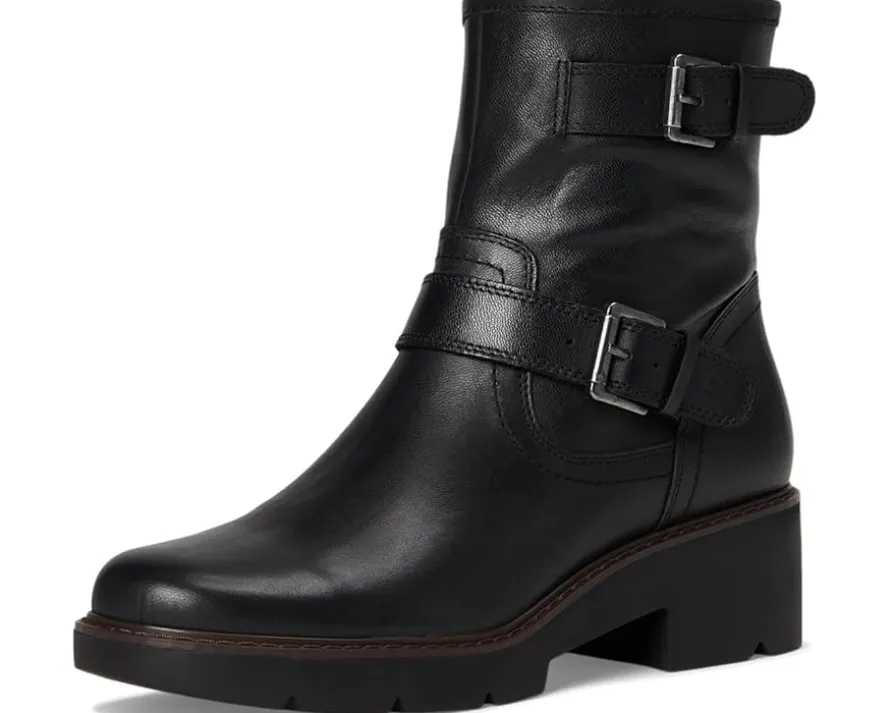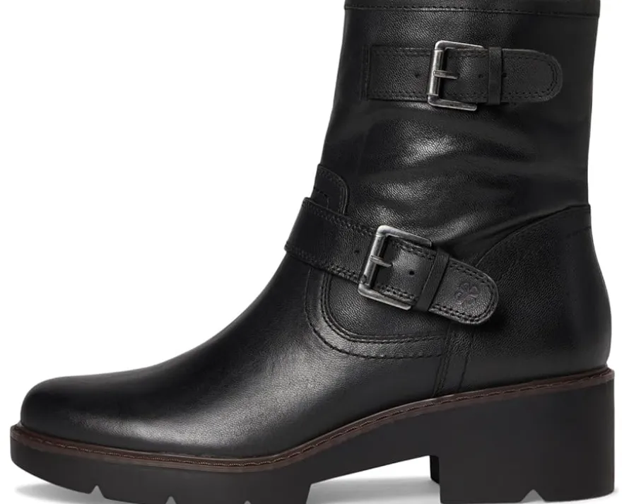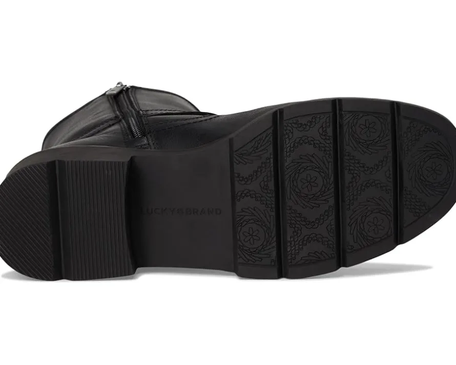 - A moto boot classic look in leather! The Lucky Brand® Migyn Double Buckle Moto Boots feature a double buckle detail, rubber outsole, leather upper, chunky block heel and zippered side closure.