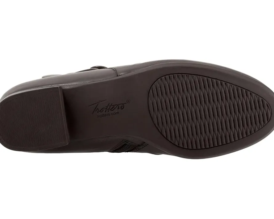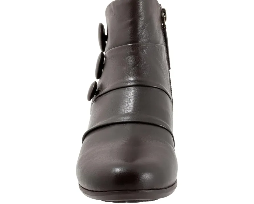 - Don a stylish look by wearing the Trotters® Mila boots. The pull-on style boots have a round-toe design, side zipper closure, three-button side design on the side, and flat heels. The leather upper ankle-high boots have a removable cushioned footbed with arch support and comfortable lining for all-day comfort.
