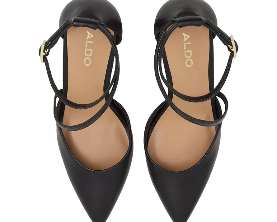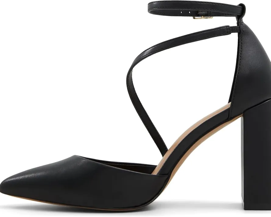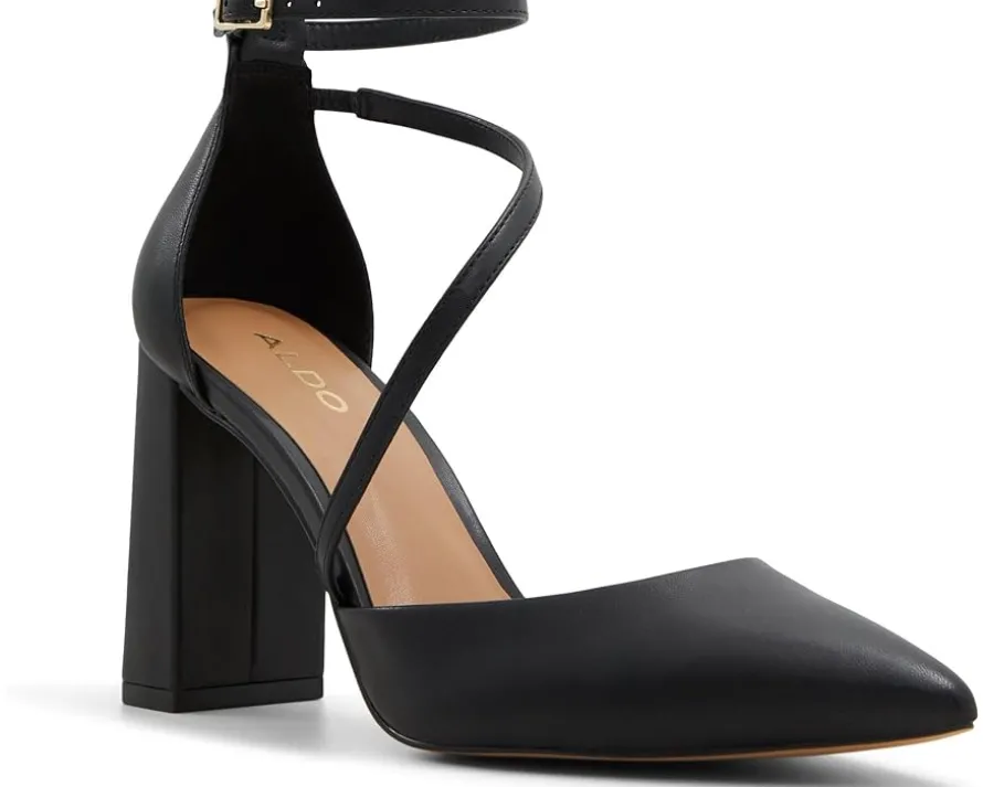 - Step out in style with the ALDO® Milley pumps, a blend of elegance and modern flair. These chic pumps feature a sleek pointed toe and a high block heel that adds just the right amount of height while ensuring stability for all-day wear. The unique wrap-around strap design elegantly encases the foot, leading to an adjustable buckle closure on the ankle strap that ensures a perfect fit and adds sophisticated detail.