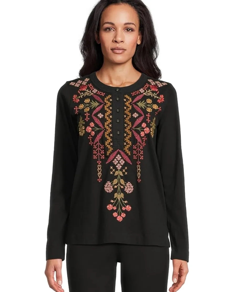 - Johnny Was® Mixed Media Henley T-shirt: The always-appealing henley gets a major upgrade in this roomy thermal-knit top with richly-detailed embroidery. It has a crew neckline, long sleeves, and a straight hem.