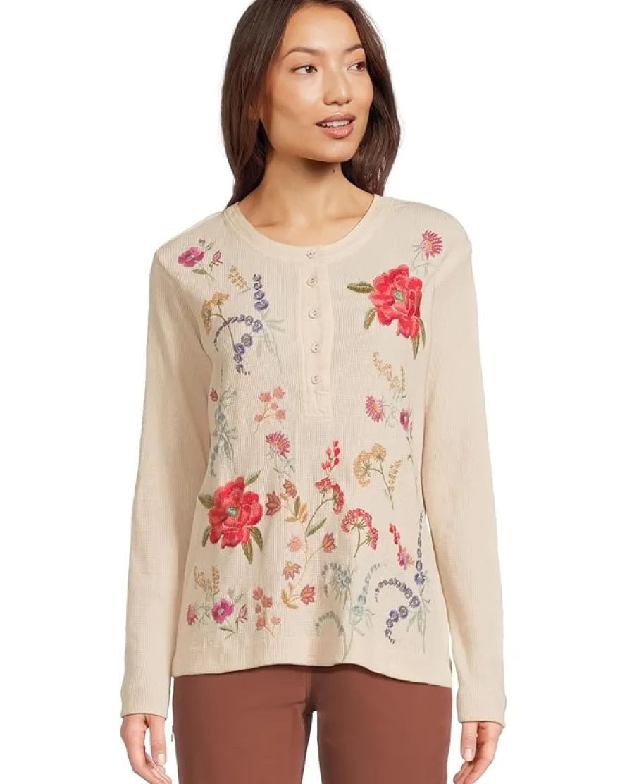 - Crafted from a polyester and cotton blend, the Johnny Was® Mixed Media Henley Thermal keeps you cozy and warm in the cold weather. Featuring bold placement embroidery in vibrant colors, this Henley top is styled with long sleeves, a Henley neckline, and a straight hem. Its half-buttoned front placket ensures easy wear. This half-button Henley makes a great addition to your wardrobe.