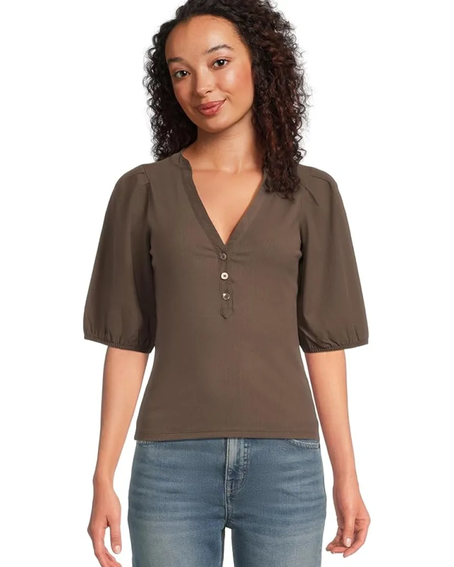 - The Madewell® Mixy V Neck Puff Tee is a great choice whether you’re getting ready for work or dressing up for a casual outing. Made from a Lyocell® blend fabric, this stylish top features short puff sleeves, a V-neckline, and a straight hem. The three-button front placket ensures easy wear. This button-down top makes a great addition to your wardrobe.