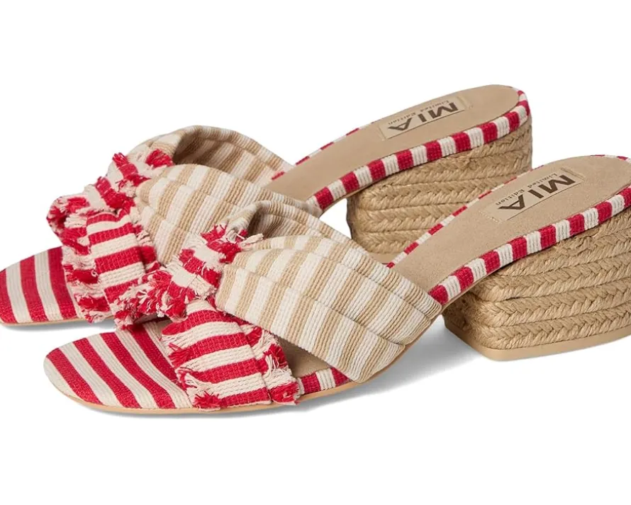 - Need a pop of color with a nautical twist? MIA™ MLE-Isandra is your girl. Crafted with flexible striped fabric and a playful knot detail, she’s as comfy as she is chic. With a broad jute-wrapped block heel, Isandra brings all the coastal vibes without needing a passport.