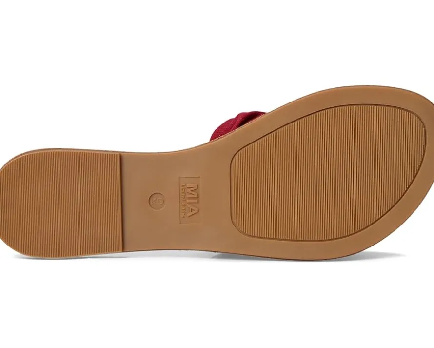 - Liven up your laidback look in the MIA™ MLE-Tiffani sandal. Featuring a genuine suede strap, flexible faux leather lining, nail head details, and a toe ring accent for a touch of glam.