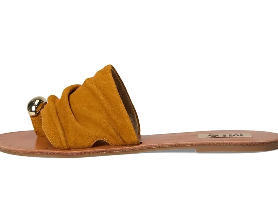- Liven up your laidback look in the MIA™ MLE-Tiffani sandal. Featuring a genuine suede strap, flexible faux leather lining, nail head details, and a toe ring accent for a touch of glam.