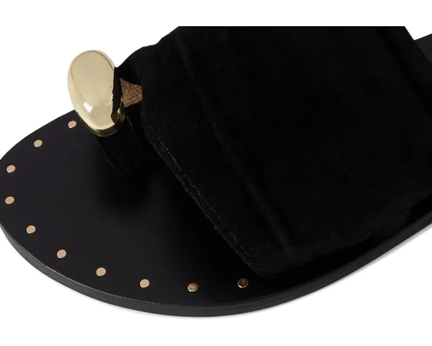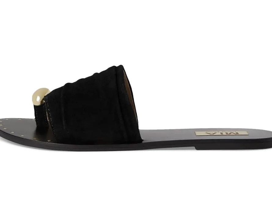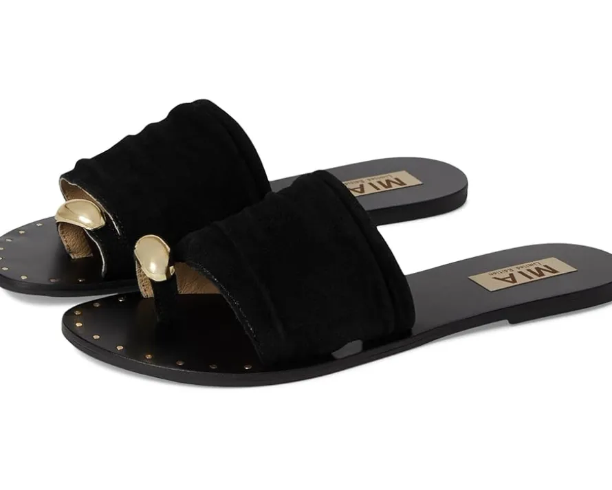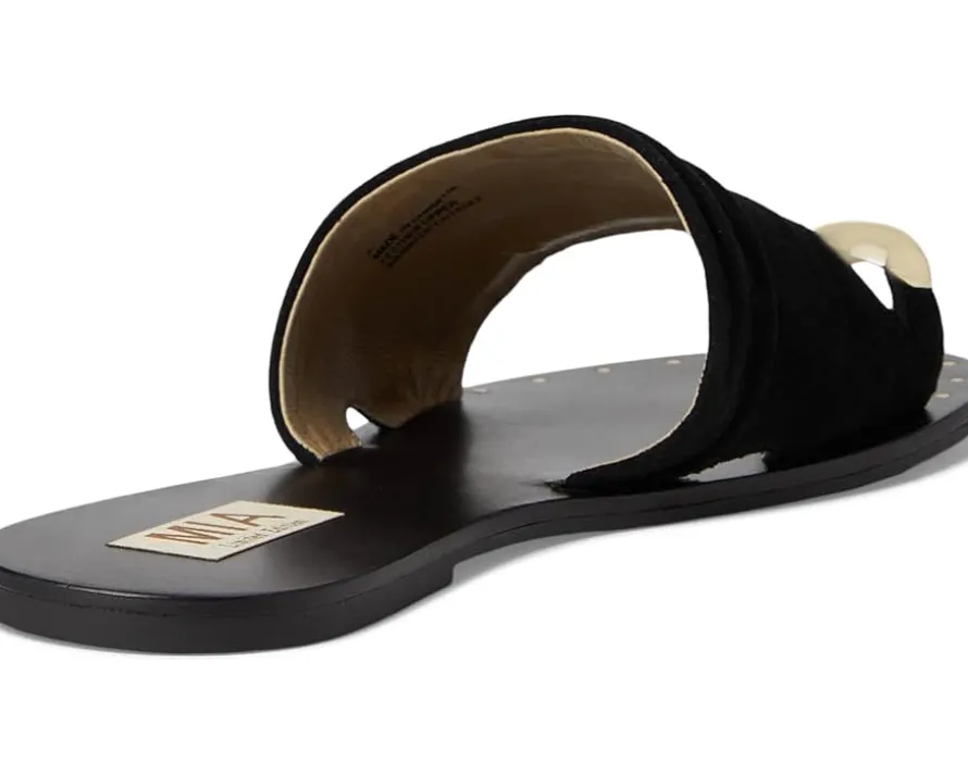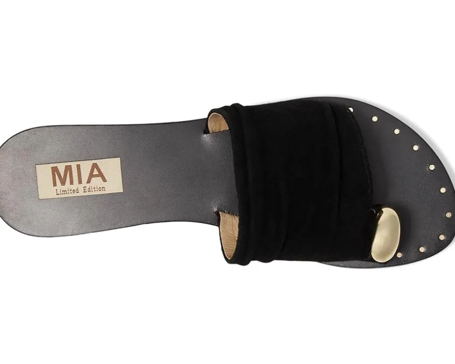 - Liven up your laidback look in the MIA™ MLE-Tiffani sandal. Featuring a genuine suede strap, flexible faux leather lining, nail head details, and a toe ring accent for a touch of glam.