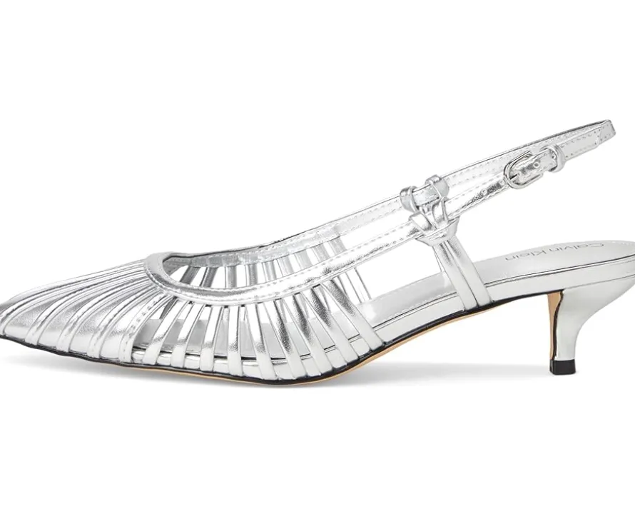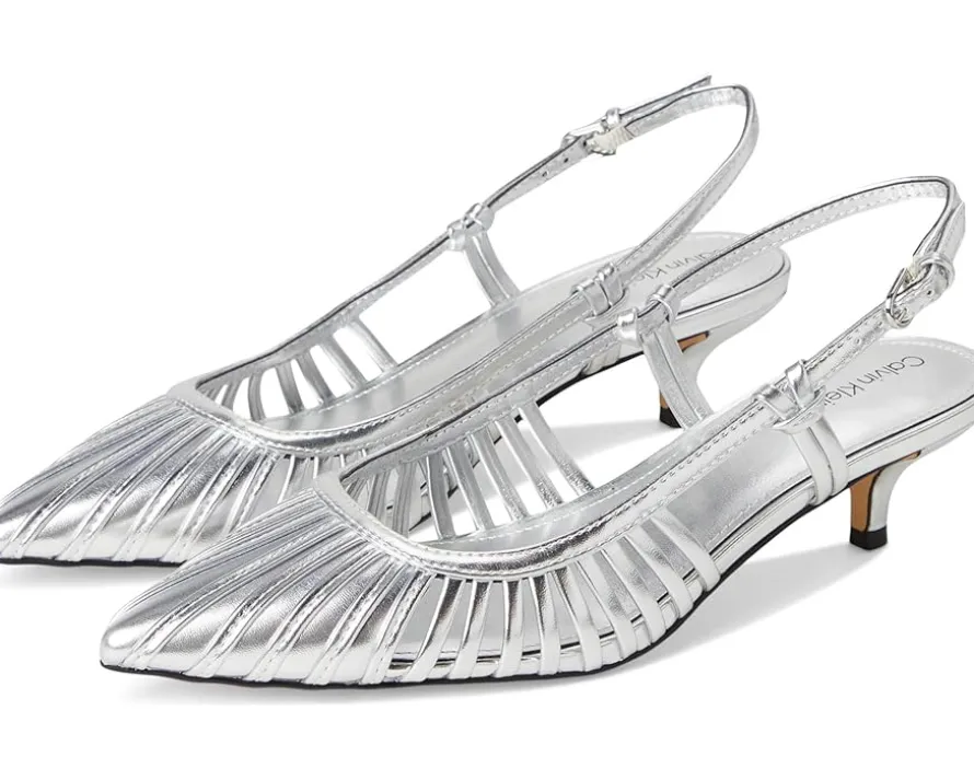 - A classic night out silhouette, the Calvin Klein® Movella heels are the perfect wardrobe staple. These heeled sandals are made of a faux leather upper, cushioned insole, and polyester lining. They feature an adjustable slingback strap, pointed toe shape, and kitten heels. These chic sandals will pair with any outfit.
