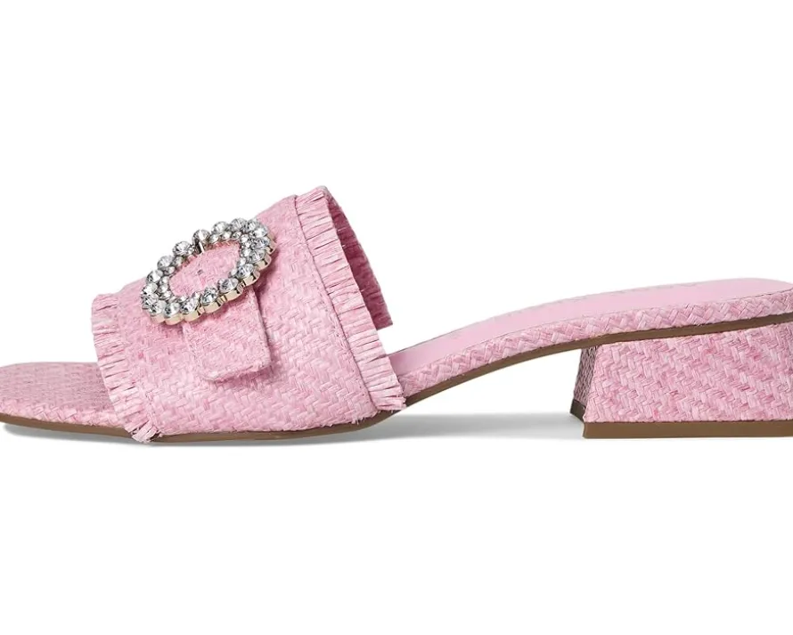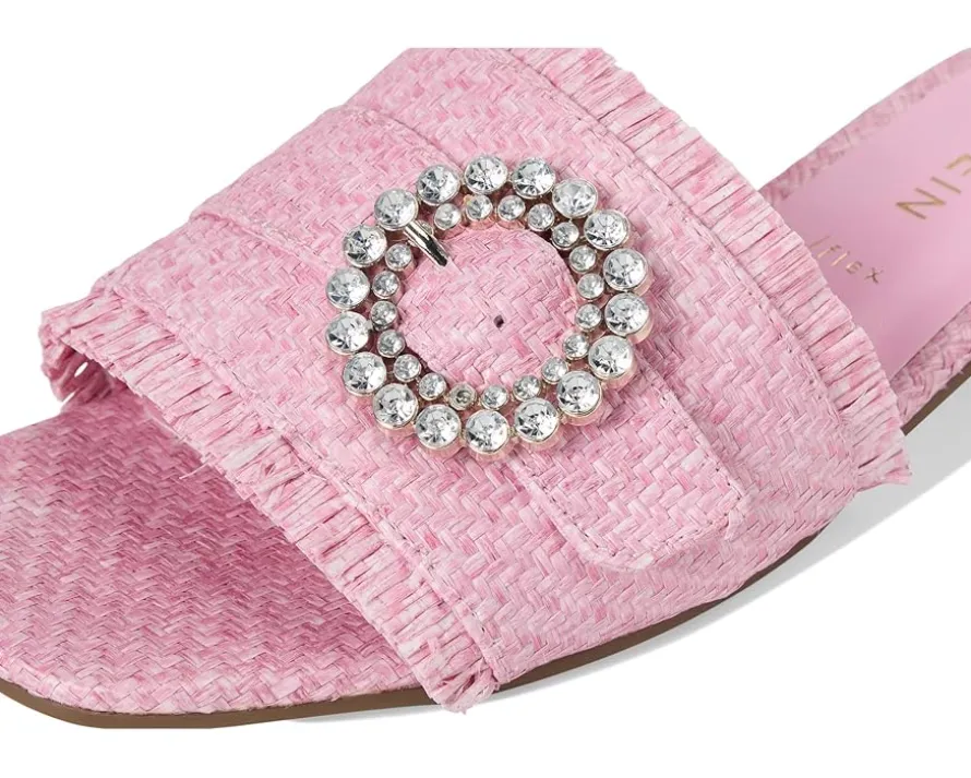 - Add a touch of comfort and style with the Anne Klein® Nahla sandals. Designed with short block heels, a cushioned footbed, and a chic woven mesh upper, these sandals effortlessly blend practicality with sophisticated flair. They are made of a rubber insole and mesh lining. These banded sandals feature a chic square toe shape and a dazzling crystal buckle detail that adds just the right amount of sparkle. The frayed edges lend a trendy, fashion-forward touch, while the low-block heels ensure comfort without compromising on style. The iFlex Technology is designed for ultimate comfort and offers a 90-degree footbend. A must-have for any modern wardrobe, these slip-on sandals are perfect for elevating casual looks or adding a polished finish to dressier outfits.