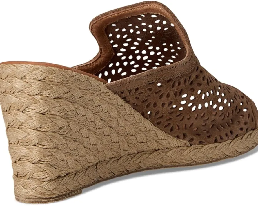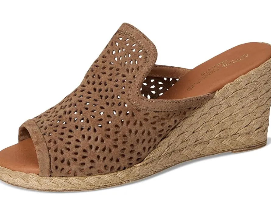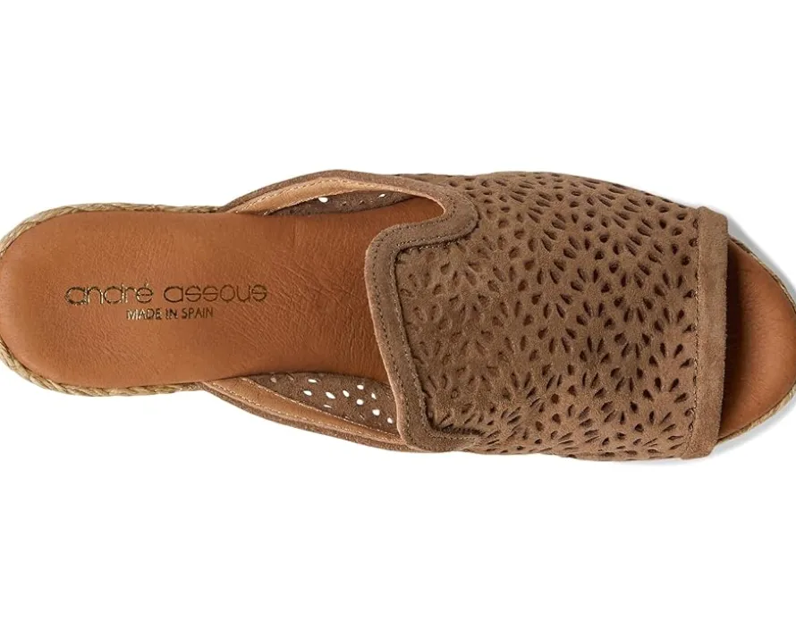 - The Andre Assous™ Nissa sandal features perforated suede upper and a slip-on design. With a raffia-wrapped wedge heel, its interior is lined with suede for all-day comfort.