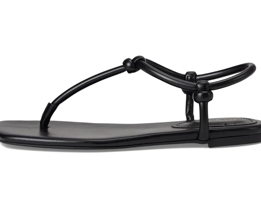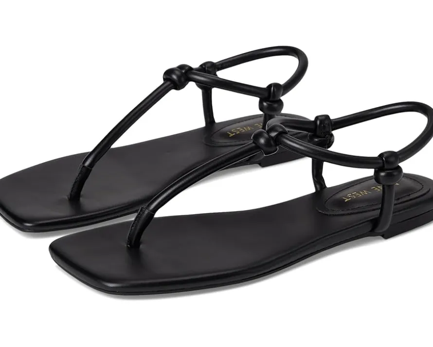 - Complete your look in the Nine West® Nortny sandals. These flat sandals feature a modern square toe shape, knot detailing, and a sleek silhouette. They are made of a faux leather upper and cushioned insole. These slip-on sandals are a must-have wardrobe essential.