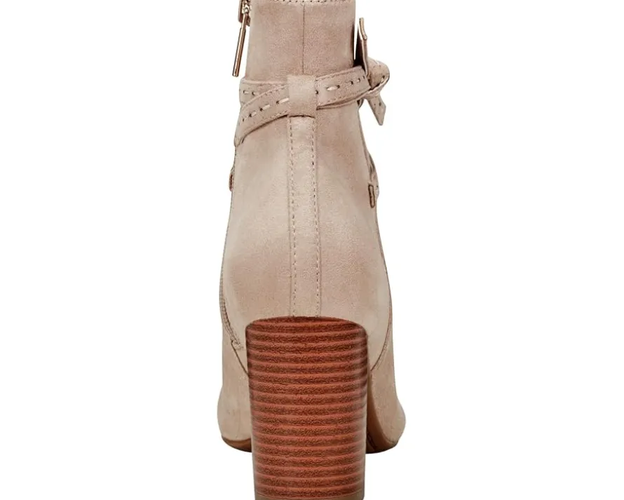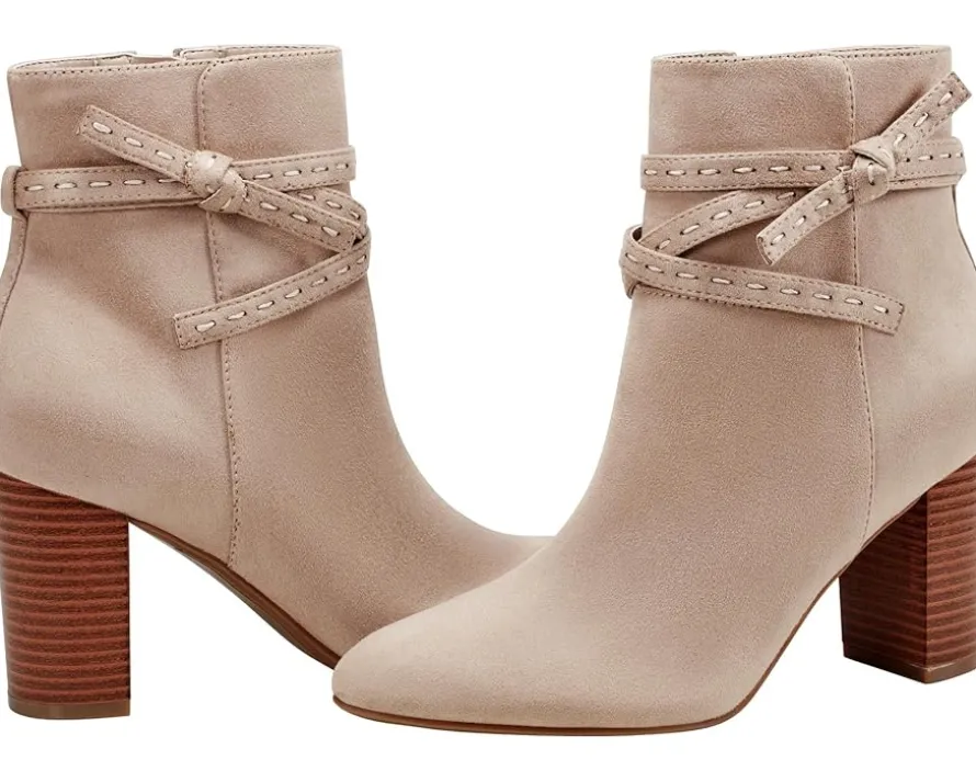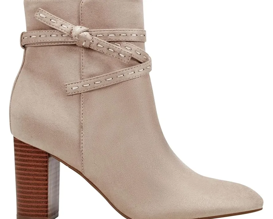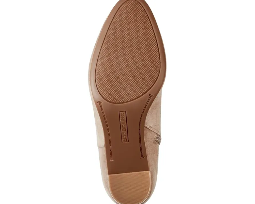 - The Bandolino® Ocorn is designed to make every moment graceful yet chic. Outfitted with a stacked block heel, this ankle bootie is styled with multiple straps and a side knot detail. The faux suede upper is accompanied by a side zipper for easy entry.