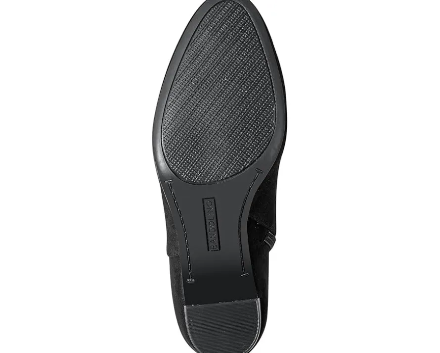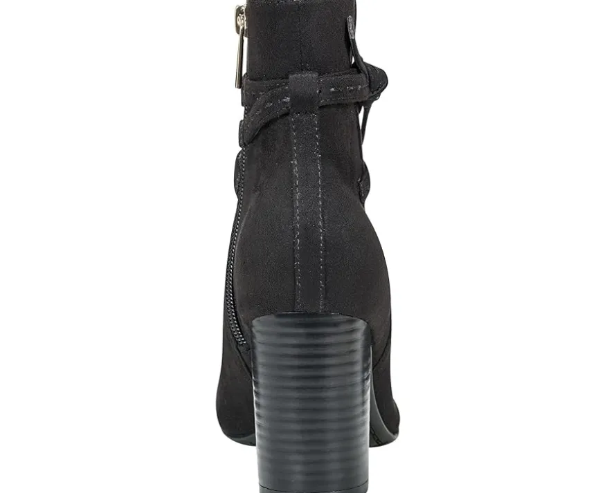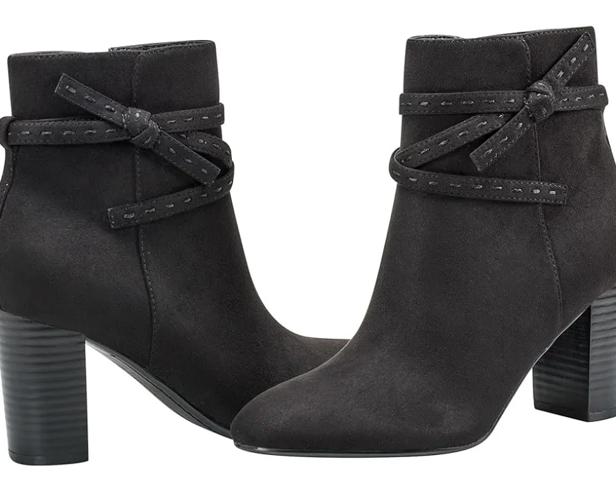 - The Bandolino® Ocorn is designed to make every moment graceful yet chic. Outfitted with a stacked block heel, this ankle bootie is styled with multiple straps and a side knot detail. The faux suede upper is accompanied by a side zipper for easy entry.