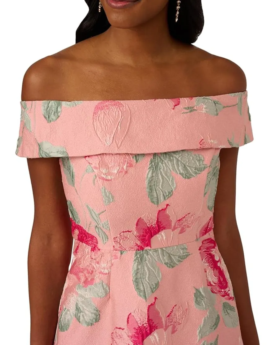 - Timeless and beautiful, the Adrianna Papell® Off Shoulder Jacquard Dress features an off the shoulder neckline with foldover accent with a fit and flare silhouette, printed jacquard and a back zipper closure.