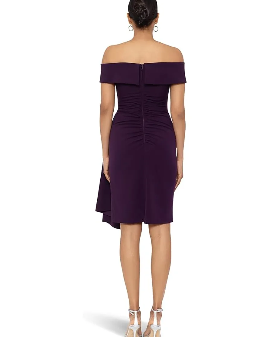 - Donne the XSCAPE® Off-the-Shoulder Scuba Crepe with Drape Dress and effortlessly accentuate an exquisite touch of style. The dress features a graceful off-the-shoulder neckline, fold-over detail at neckline, draped details on the side waist, and an asymmentrical hem.
