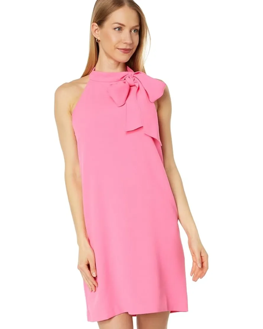 - The Vince Camuto® Open Back Halter Neck Crepe Shift Dress with Bow adds a perfect pop of color to your look.