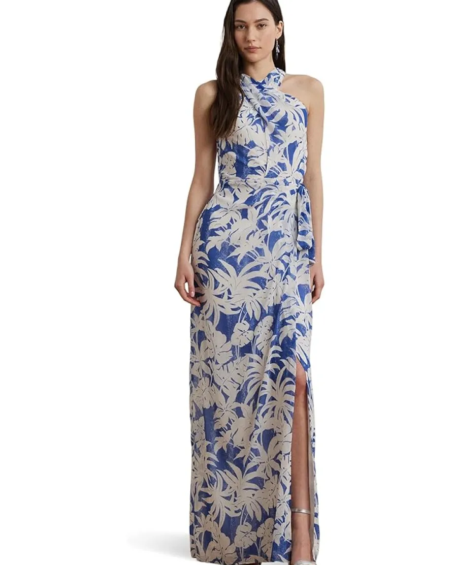 - Turn heads in the Lauren Ralph Lauren® Palm-Frond-Print Georgette Halter Gown blends effortless elegance with a touch of island romance. Crafted from airy crinkle georgette for soft movement and textured charm, this column silhouette cascades gracefully to the floor. A crisscross halter neckline brings a chic, modern twist, while the sleeveless design and subtle front pleats add breezy sophistication. The self-tie accent cinches the waist beautifully, enhancing your shape with a tailored touch. A flirty side slit adds allure, while a concealed zipper on the back ensures a smooth fit. Fully lined for comfort and confidence, this gown is your go-to for sunset weddings, beachside soirées, or upscale vacations. The palm-frond print whispers getaway vibes with every step-proof that your style can take you places.