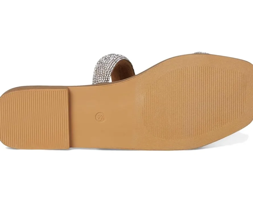 - The Madden Girl® Partly is a flat sandal favorite, featuring a flat heel, squared open toe and slip-on closure. It is designed with microsuede upper material and rhinestone embellishments.