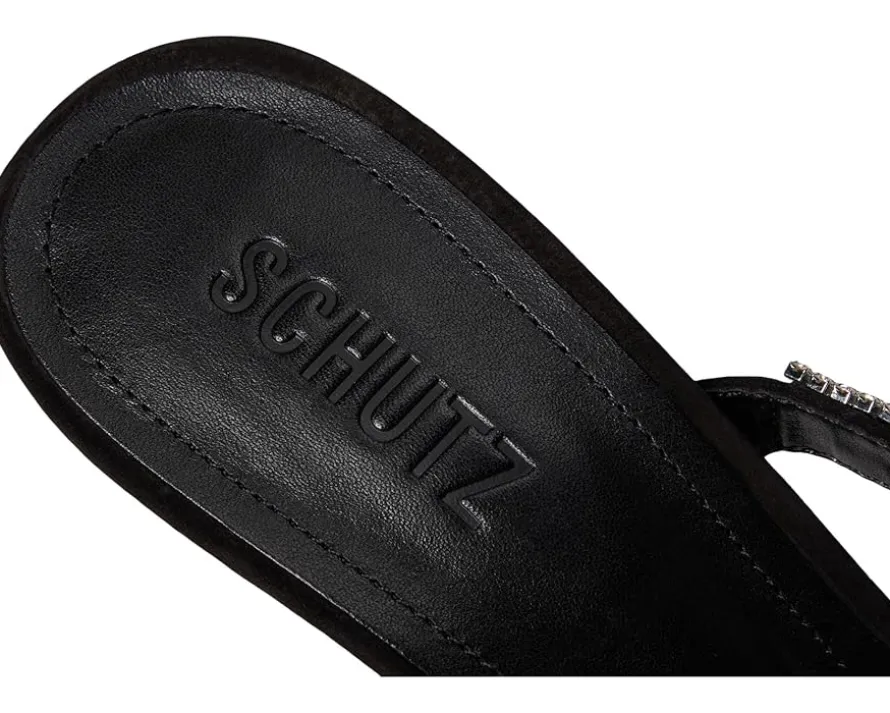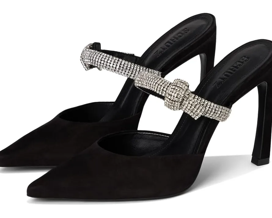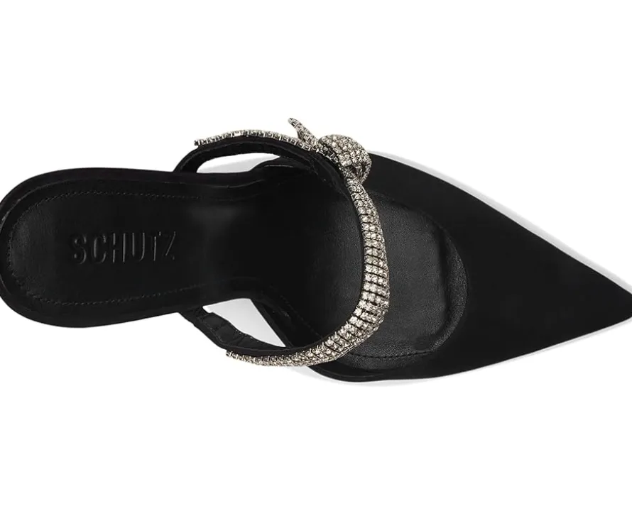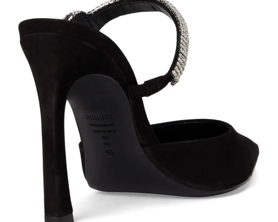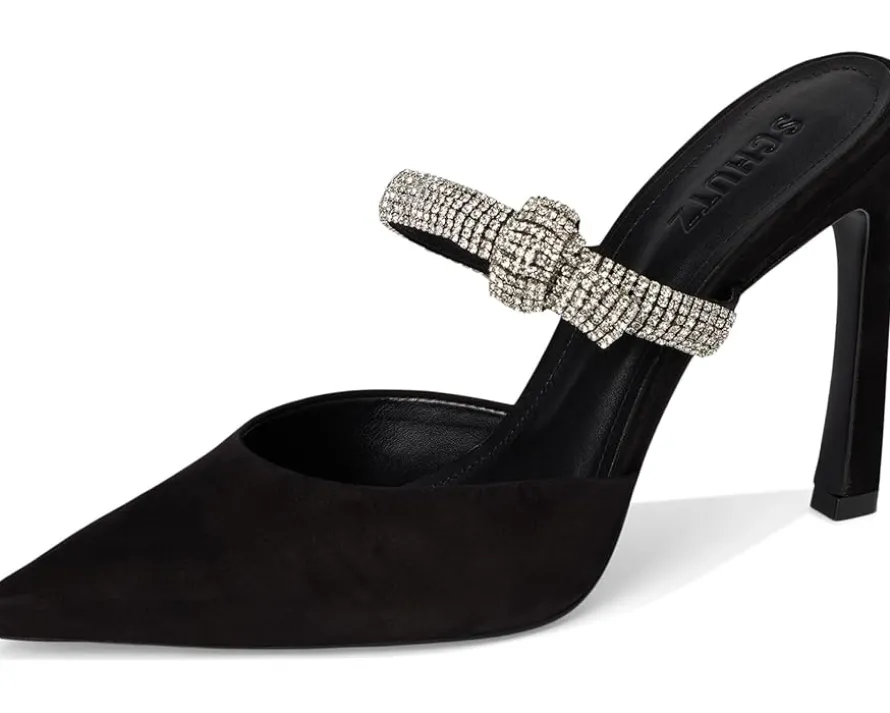 - Add an exquisite touch to your partywear looks wearing Schutz® Pearl Curve Pumps. The pointed toe pumps are crafted with a leather upper, leather lining, and ethylene vinyl acetate insole. The elastic front strap with crystal bow detailing and stiletto heel elevate the style.