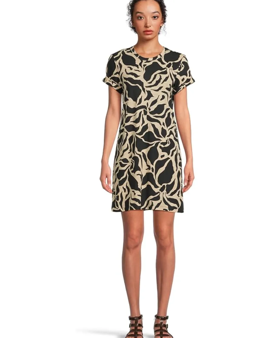 - Dress fashionable wearing the Sanctuary™ Perfect Tee Remix Dress. This dress features crew neckline, short cuffed sleeves, relaxed fit, back seam details, allover graphic print, and self tie belt at the waist.