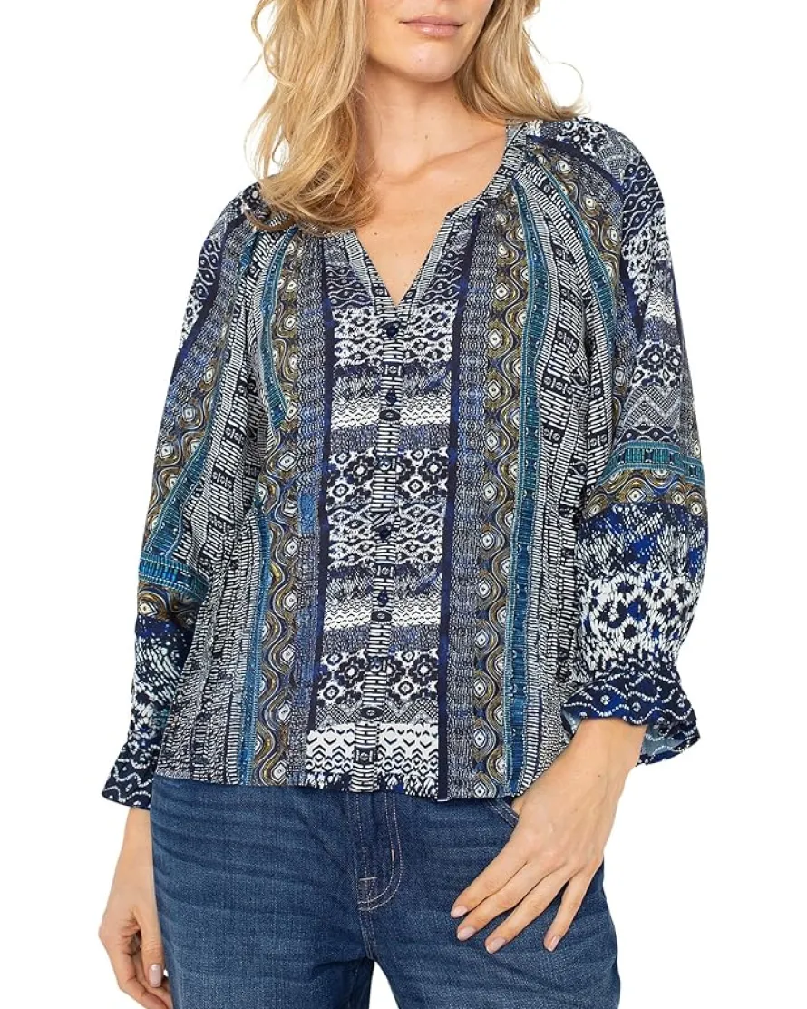 - The Liverpool™ Los Angeles Petite 3/4 Sleeve Button Front Woven Blouse is the perfect blend of contemporary femininity. With this vibrant print, add a burst of color to your wardrobe, guaranteed to make a statement…or just to brighten your day!