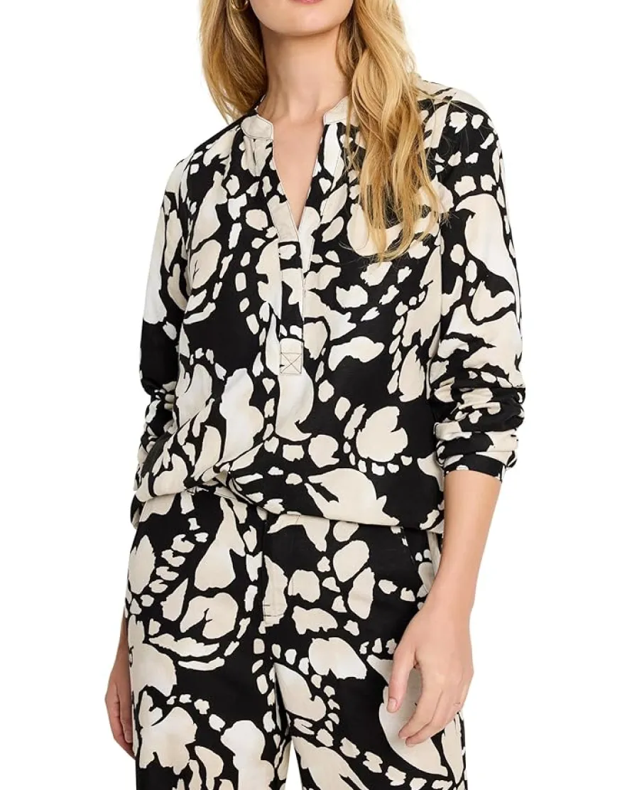 - Bring an elevated touch to everyday style with this NIC+ZOE™ Petite Evening Petal Woven Shirt featuring always-on-trend linen. Crafted from a new, refined linen blend that features a luxe weight while showcasing vibrant prints beautifully. The silhouette features a flattering V-neckline with a banded collar, long sleeves with buttoned cuffs, and a back elasticized waist for a gently shaped silhouette.