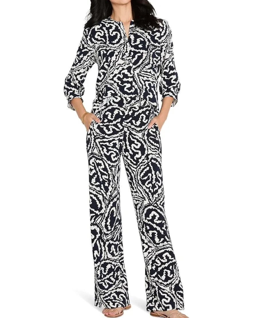 - A new fabric Double Crepe makes its debut: featuring the delicate feel of crepe with a little more body, perfect for work, events, and adding a little elegance to your everyday. Love the large-scale Indigo Leaf print, a bold bi-color that matches back with denim or more elevated pieces. With a hidden button placket down the button front and a flounce to the cuff: more details to die for.