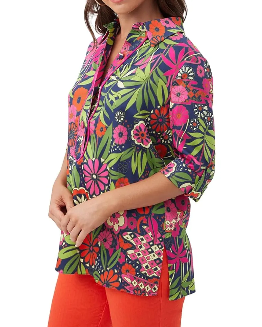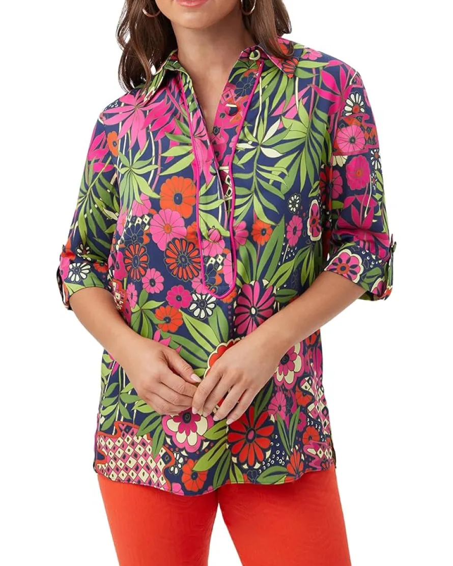 - The Trina Turk™ Portrait 2 Top is a floral print button-up blouse with a pointed collar, straight hem, and three-quarter cuffed sleeves. Made from rayon fabric for all-day comfort, this printed top is a great choice to add a vibrant twist to your everyday looks.
