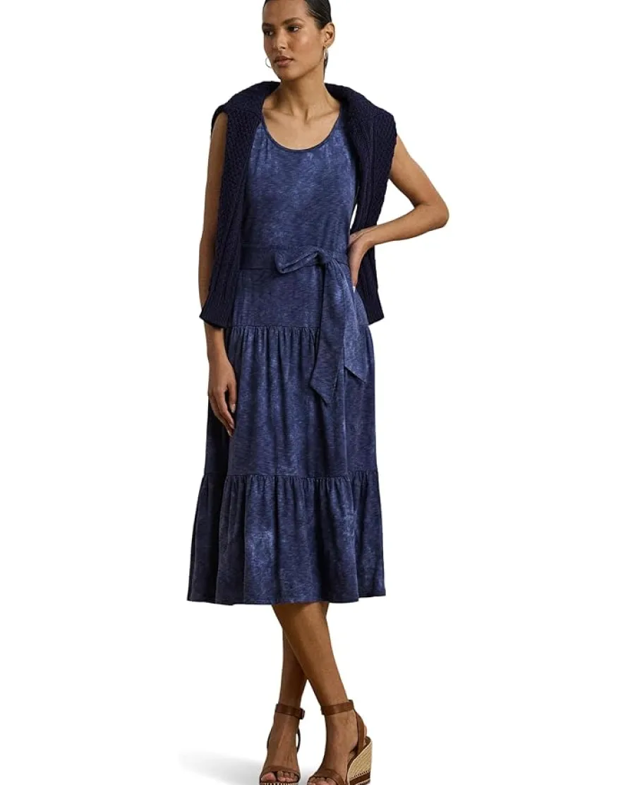 - Crafted with soft slub cotton-blend jersey, this Lauren Ralph Lauren® Print Belted Slub Jersey Tiered Dress features a belted waist, a fluid tiered skirt, and a marbled, cerulean print inspired by the Mediterranean sea. This dress features a scoop neckline and sleeveless silhouette, perfect for warm weather. With pull-on styling and an elasticized waist, it’s easy to slip into for a day of fun in the sun.