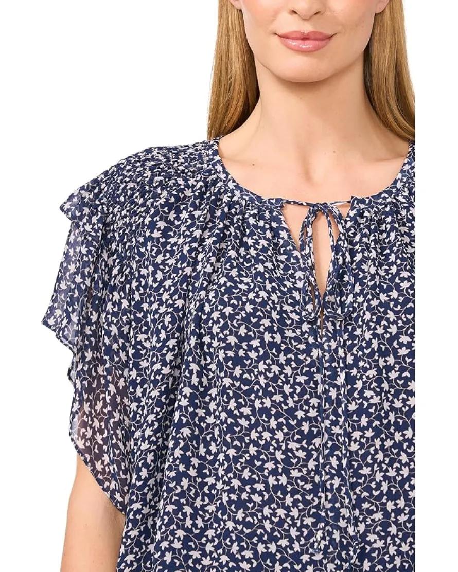 - Flirty yet refined, the CeCe™ Printed Tie Neck Double Ruffled Sleeve Top makes a chic statement with its lightweight and allover floral-designed silhouette. The classic pullover top features a tie neckline is finished with faux pearl accents and double ruffled sleeves with intricate shoulder smocking.