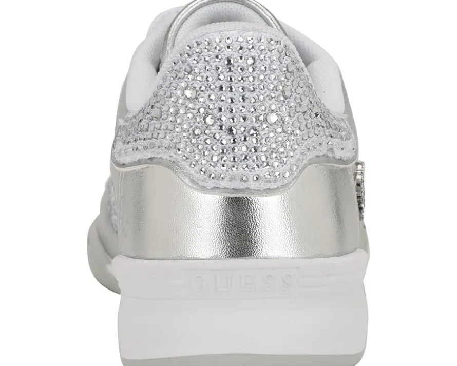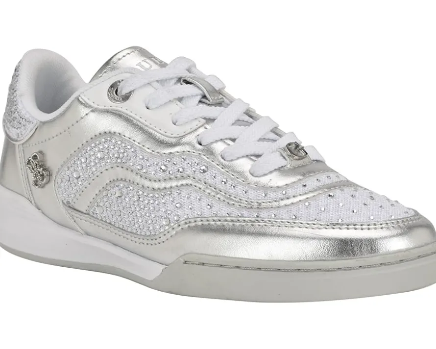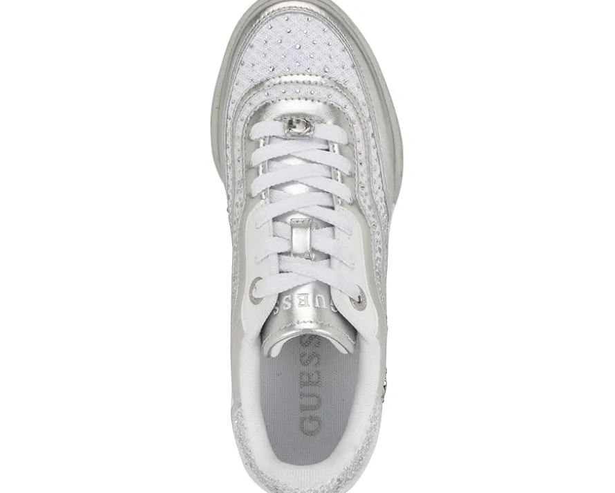 - Shimmering rhinestones embellish the GUESS® Pritie, a classic lace-up sneaker grounded by a retro-inspired sole. The footwear features polyurethane upper construction with textile lining and cushioned insole for all-day comfort.