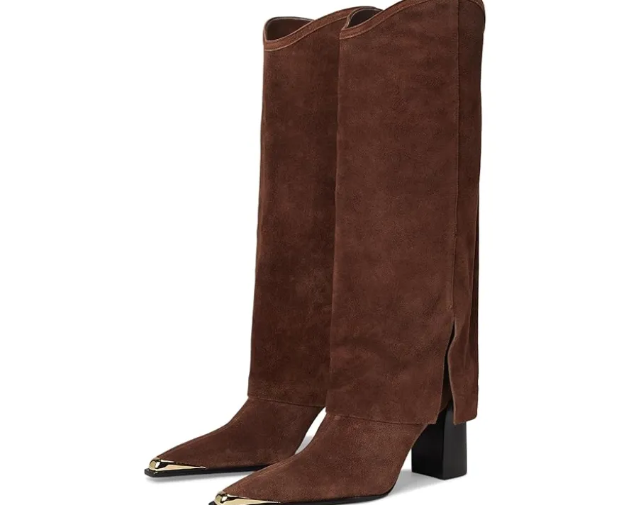 - The Schutz® Raffaela Up Cloak Boot blends texture and subtle shine for a modern take on knee-high boots. Soft suede forms the base, layered cloak detailing adds depth, and the pointed toe design is accented with a polished gold tip. The mid-block heel creates a flattering lift, making this boot a versatile option for elevating both casual and refined looks.