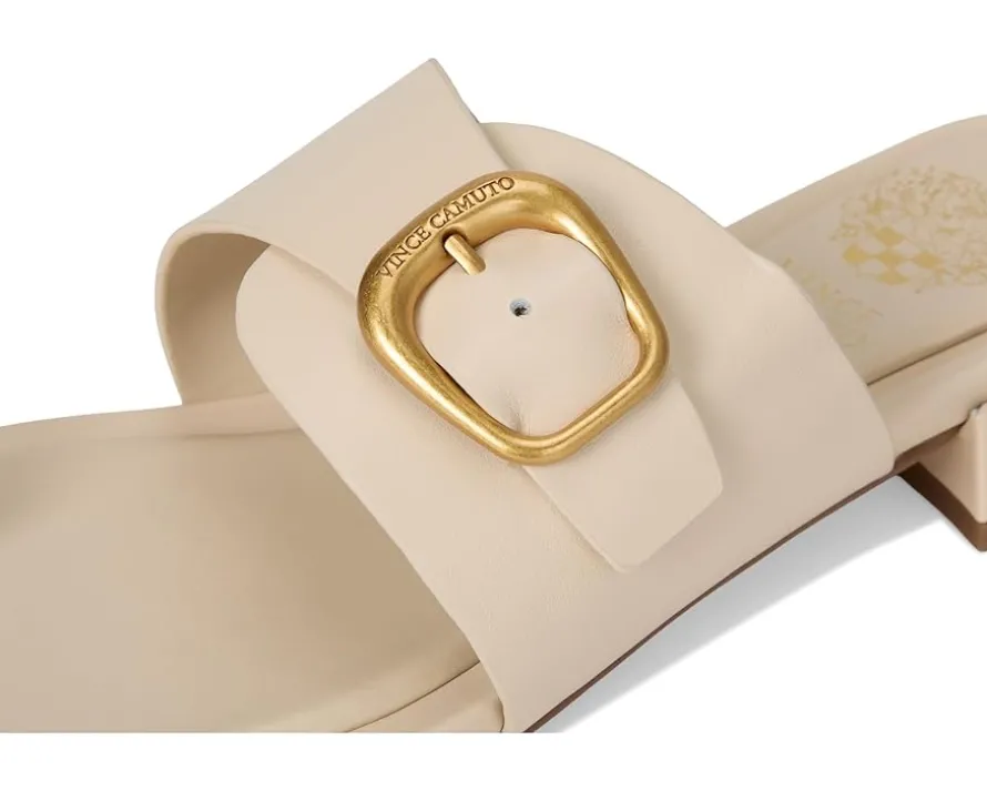 - The Vince Camuto® Ranista Buckle Band Sandals combine sophisticated design with everyday comfort. Featuring an open, round toe shape and are squared-off over the heels, these sandals offer a chic yet practical lift. They are equipped with a toe loop strap and an adjustable instep strap, complete with a bold metal buckle etched with the brand name for a touch of signature style. The padded footbed and rubber outsole ensure all-day comfort, making them the perfect choice for summer Fridays, whether you’re in or out of the office. These slide sandals are made of a leather upper, faux leather insole, and polyurethane lining. Lightweight and stylish, these leather sandals are a stylish and versatile wardrobe essential.
