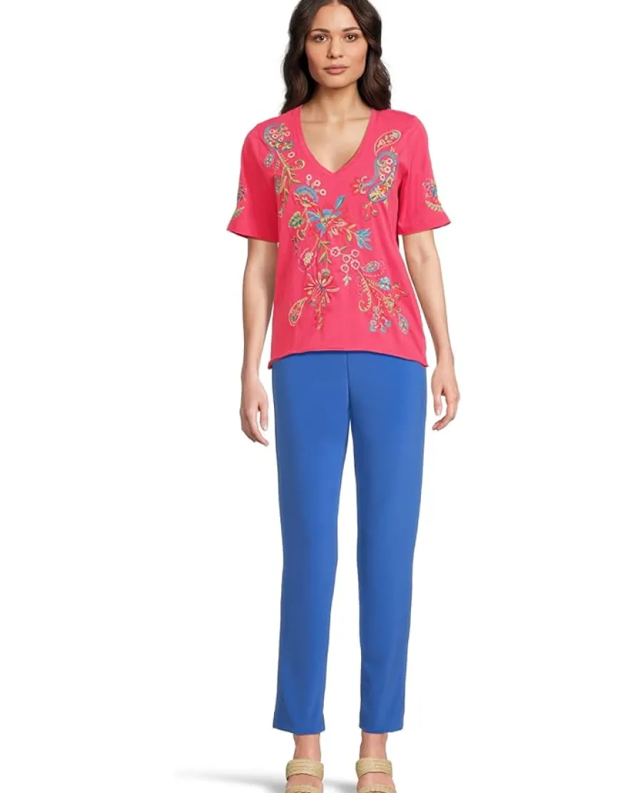 - Style up your look by pairing your favorite jeans with the Johnny Was® Raw Hem V-neck Tee – Karime. This vibrant short-sleeve blouse is crafted in a bold fuchsia pink fabric and features a flattering V-neckline. Delicate floral embroidery in shades of light blue, orange, and gold is scattered across the front and sleeves, adding texture and visual interest. The silhouette is boxy and relaxed, offering comfort without sacrificing style.