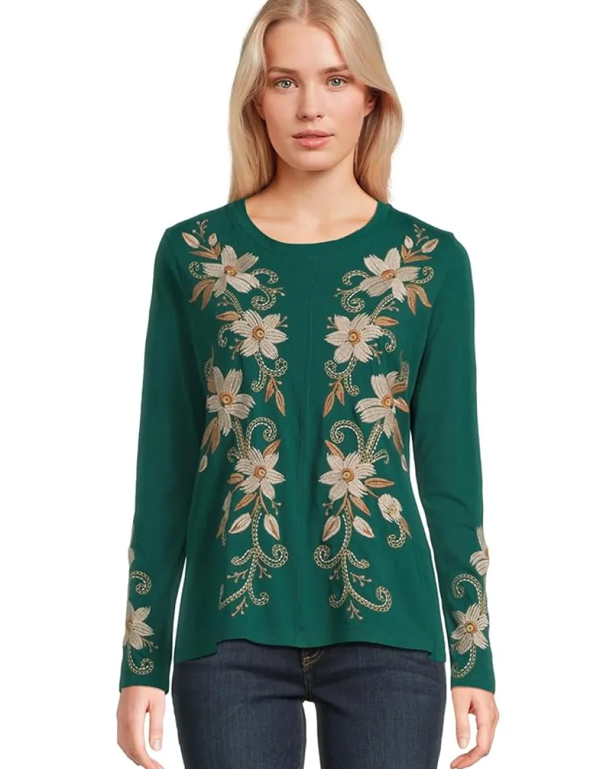 - Elegant and refined, the Johnny Was® Raw Seam Crew Neck Tee – Corinthe blouse is beautifully embroidered with soft florals that cascade down the front and sleeves. With its classic crew neckline and flattering fit, it’s a versatile piece that brings a touch of sophistication to both casual and dressed-up looks.