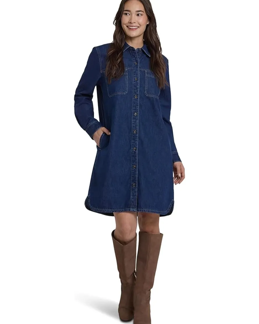 - NYDJ® Reese Denim Shirtdress is a perfect pick you’ll turn to again and again. This effortless button-down dress features classic shirting details, from a point collar to yokes in the front and back to long sleeves with buttoned cuffs. Finished with two front patch pockets and side hem slits.