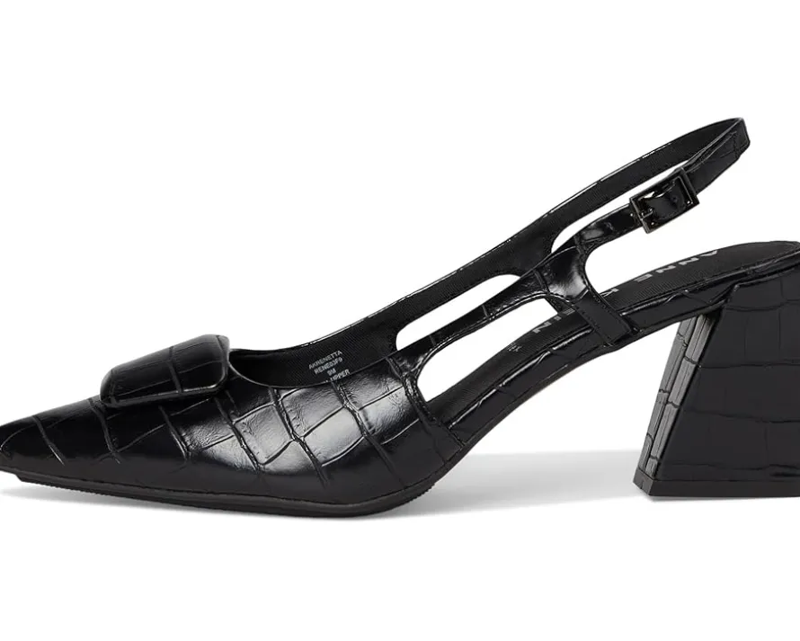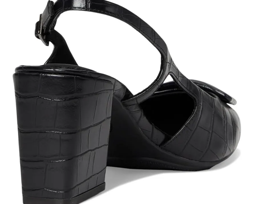 - Slingback strap with buckle closure.