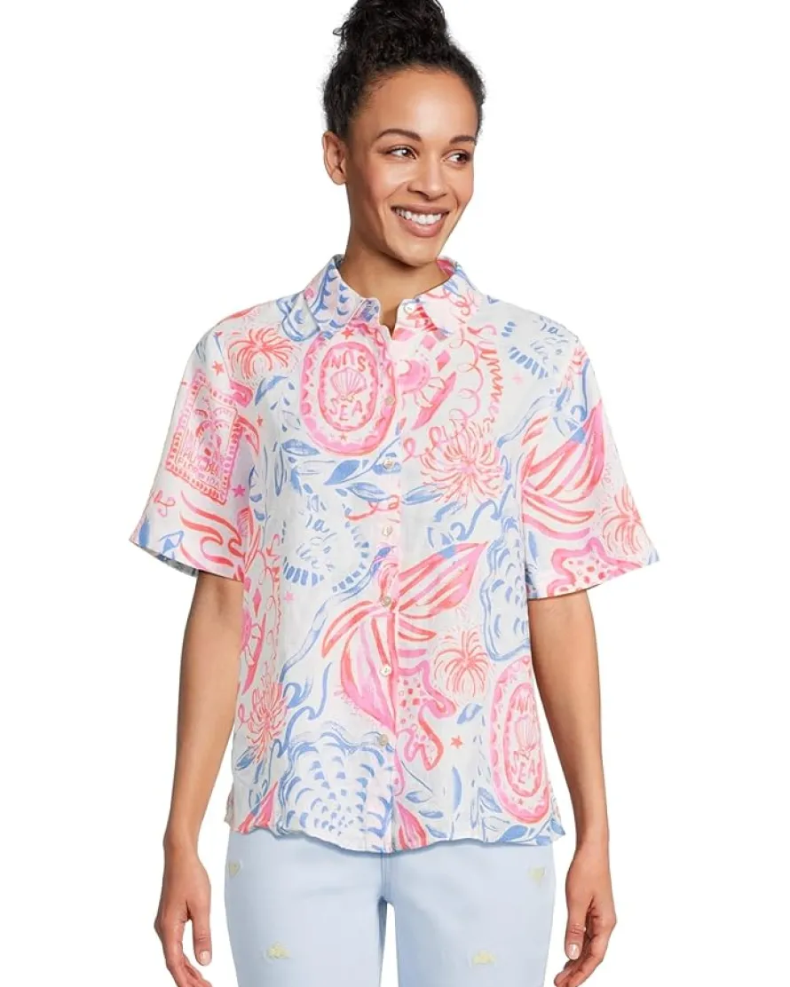 - The Lilly Pulitzer® Ridoc Top is a breezy, relaxed fit shirt crafted from linen for lightweight comfort and effortless style. Featuring short sleeves, a collared neckline, and a button-front closure, it offers a loose silhouette with an allover vibrant print pattern.