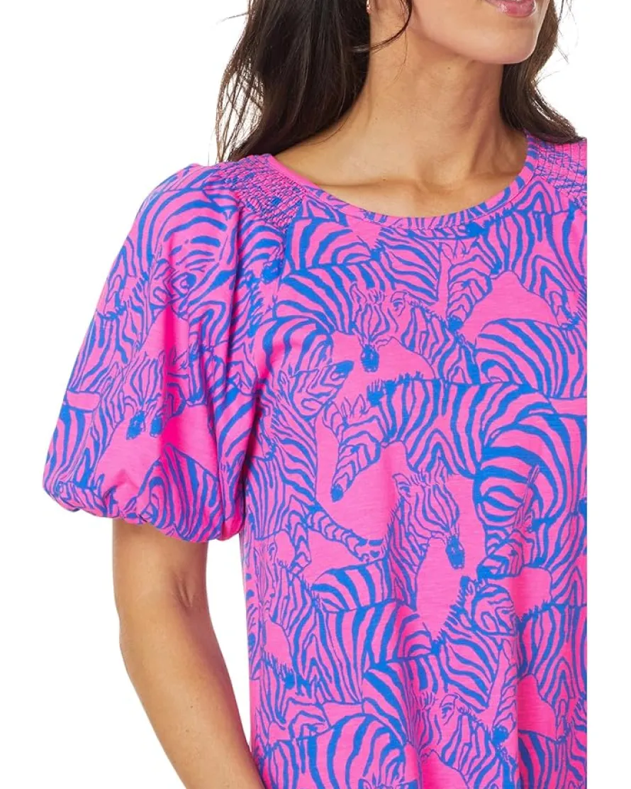 - Twirl into elegance wearing the pull-on style Lilly Pulitzer® Rosen Dress. This easy fit t-shirt dress features crew neckline, short bubble hem sleeves, allover floral print, and smocking detail at shoulders.