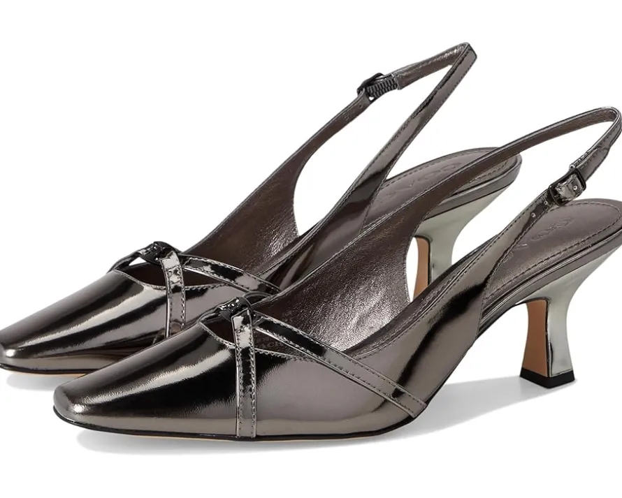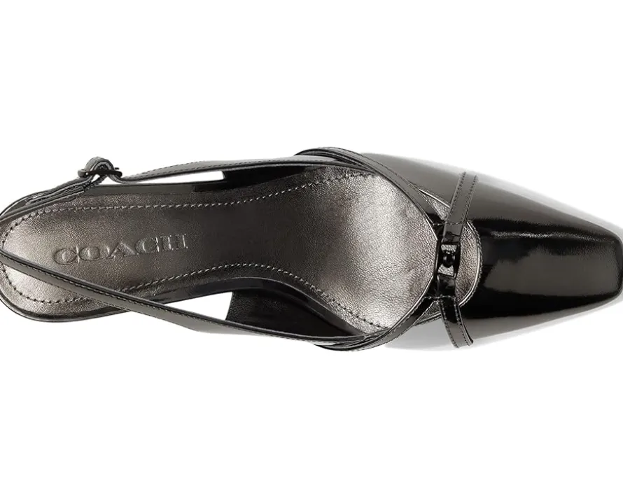 - From the desk to dinner, maintain your effortless style in the COACH® Rowyn Metallic Leather Slingback. Crafted from a smooth metallic leather upper, these shoes offer a slender square toe silhouette with an adjustable slingback buckle closure strap and a kitten heel.
