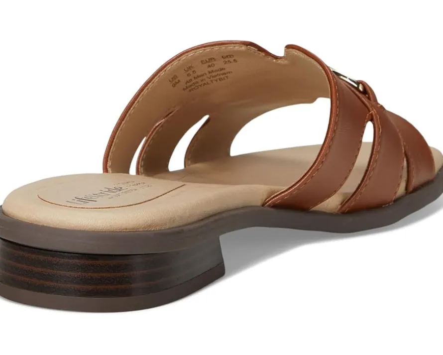 - Perfect for travel or every day, the LifeStride® Royaltybit sandals are equally versatile, casual, and chic. Their polyester upper features an open square toe silhouette, slip-on fit, and metallic ornament detail while the trusted Soft System® comfort technology provides unmatched cushion, support, and flexibility in every pair. These heeled sandals are made of a foam insole and polyurethane lining. The traction synthetic rubber outsole offers extra stability.