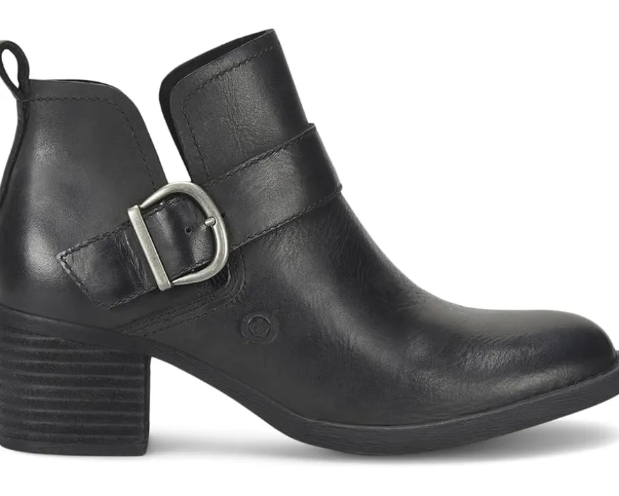 - Børn®’s low-heeled boot, accentuated by a chic side buckle, adds a touch of sophistication to this versatile and comfortable footwear choice. Crafted from a hand-finished full grain leather upper, breathable soft fabric suede lining, and a soft fabric suede covered footbed with extra foam for added comfort.