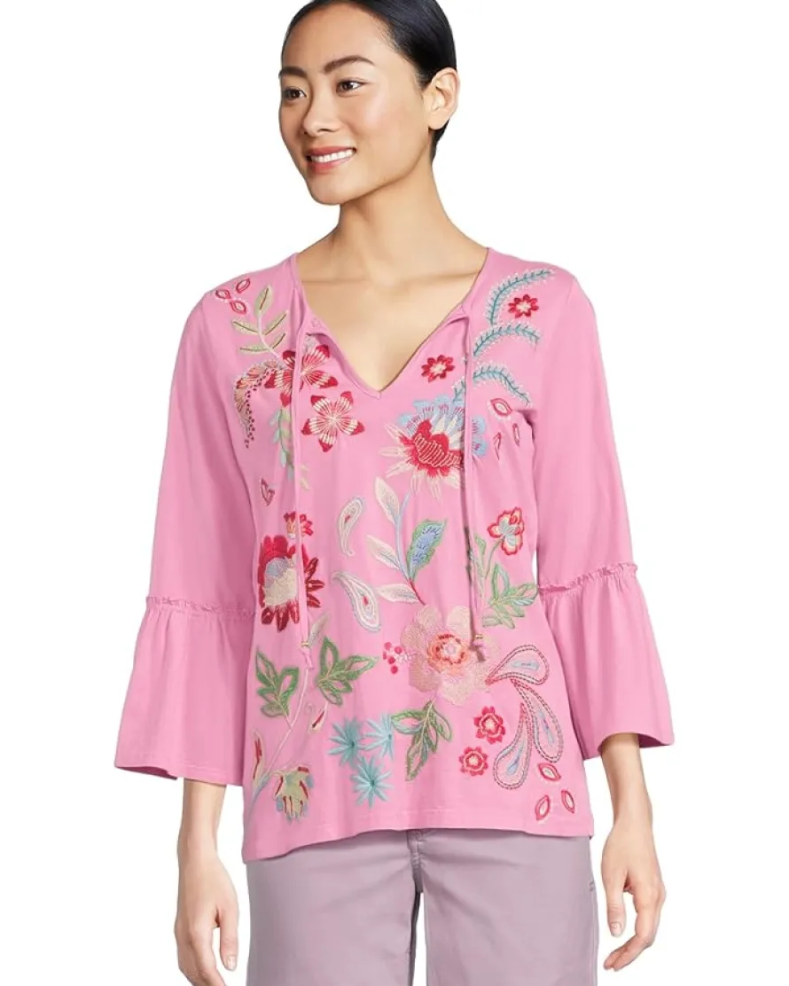 - Crafted for style and breathable comfort, the Johnny Was® Ruffle Sleeve T-shirt is the perfect addition to your casual wardrobe. The pull-on style tee features a V-neckline with tie-up detail, three-fourth ruffle sleeves, a straight hem, and a vibrant embroidery allover for added splash of color.