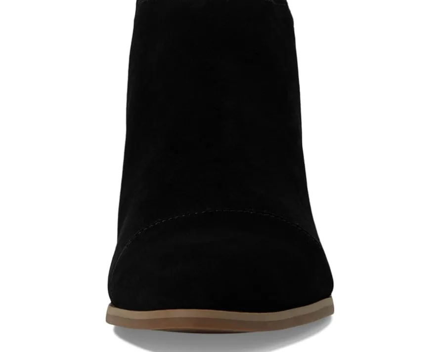 - Conquer the day wearing the classic TOMS® Rylie. Crafted from suede upper, polyester lining, and polyurethane insole, this pair of flat ankle booties features zippered back closure, almond toe, topline cutout detailing with quarter underlay, and stacked leather wrapped heel for a modern look.