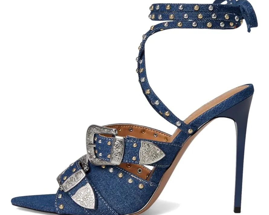 - Introducing the Saddle heeled sandals, exclusively from Steve Madden®. It is crafted with studded metal buckle detailing and ankle-wrap tie closure, blending edgy western flair with high-fashion polish. The polyurethane upper and nylon lining, and insole ensure lasting comfort.