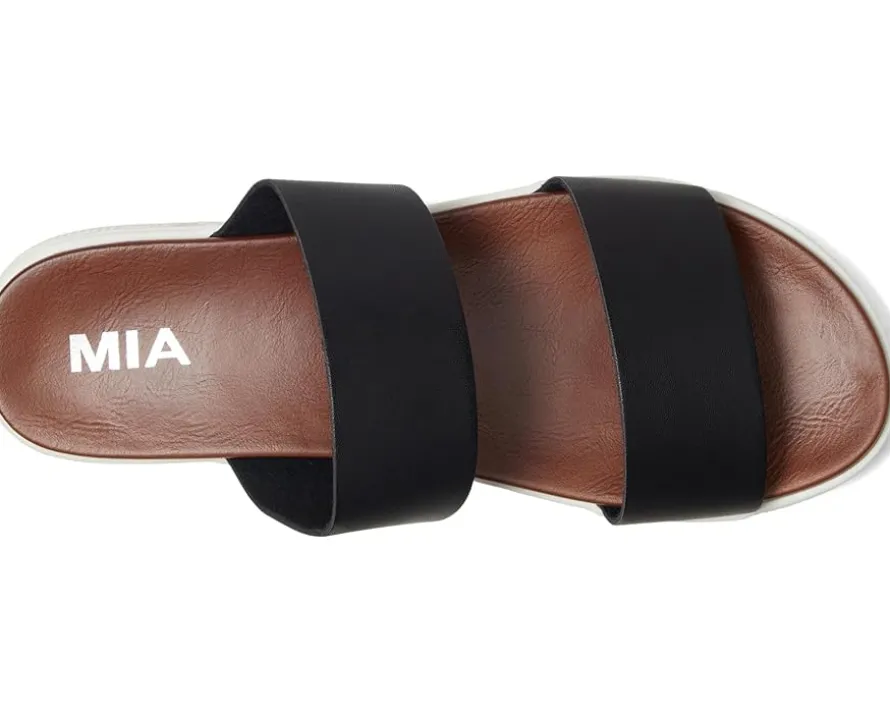 - Get adventurous this summer with the MIA™ Saige slides. Designed from vegan leather, this everyday sandal features two wide straps along the upper for a secure fit, a cushioned insole for everyday wear, and an elevated non-slip sole.