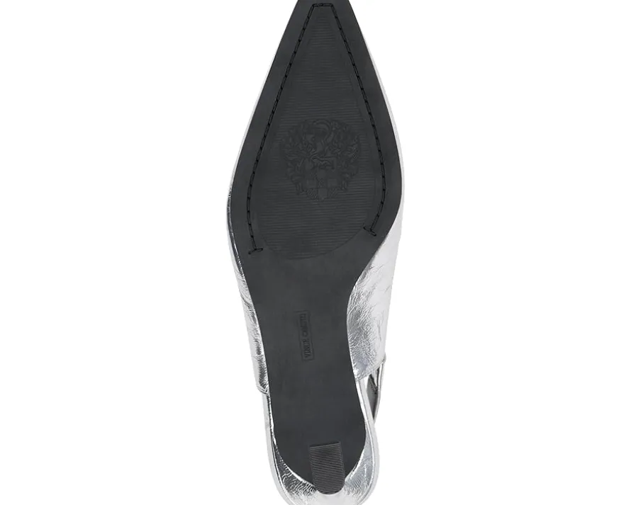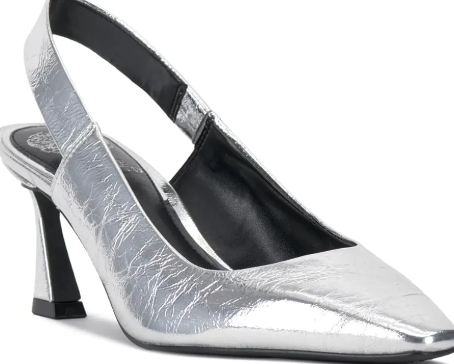 - Clean and classic describe this Vince Camuto® Samila Slingback Pump with elastic gored strap and flare heel. Constructed with a snip toe and leather covered heel, this slingback provides adequate coverage and padding to keep your feet happy and simple details like metallic trim on the sock to keep the eyes happy.