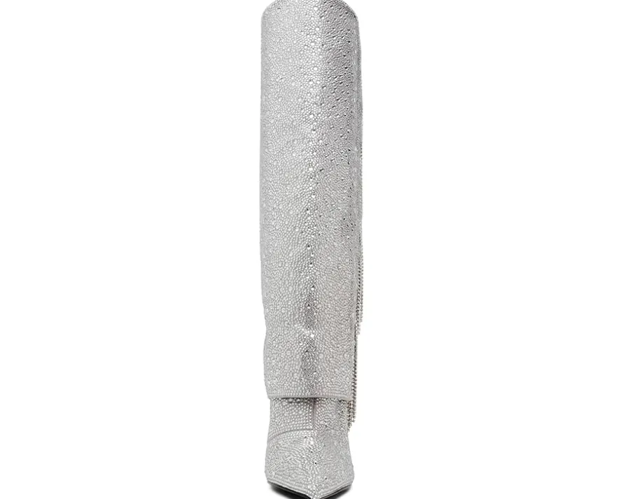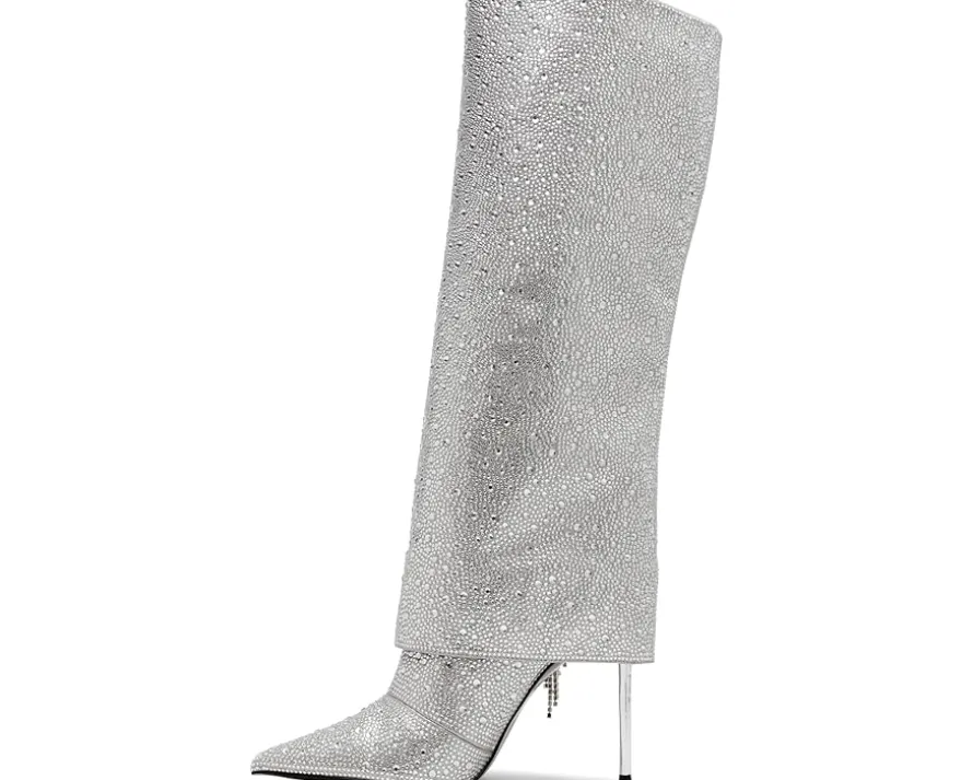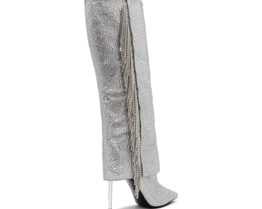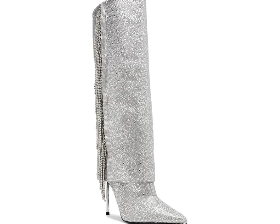 - The Steve Madden® Sanya Knee-High Boots boast an extremely captivating look with the rhinestone embellishments and side fringe panel. With a pointed toe silhouette, the pull-on footwear features synthetic upper and a sleek stiletto heel.