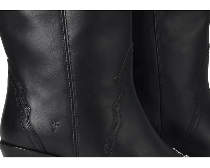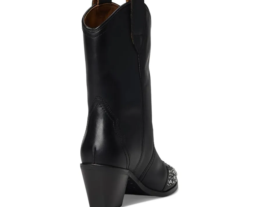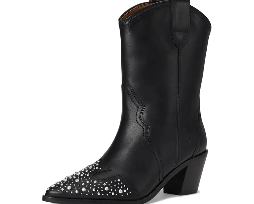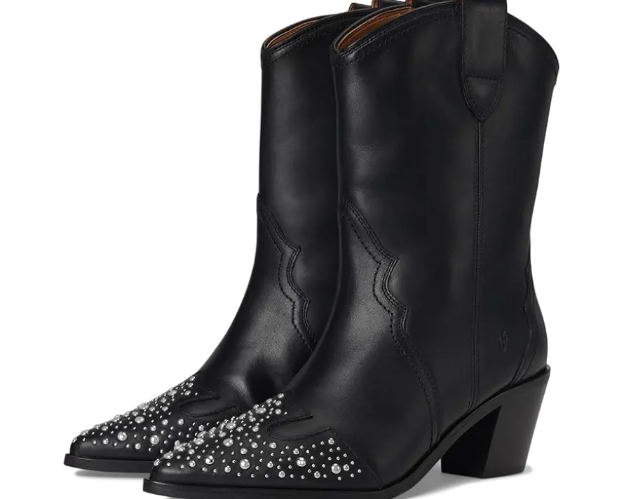 - The Frye® Sara Wingtip Stud ankle boot brings a bold, Western-inspired edge to everyday style. This design features a pointed toe, chunky block heel, and wingtip detailing accented with metal studs, giving it a modern twist on classic cowboy flair. The mid-calf profile makes it easy to pair with everything from denim to flowy skirts.